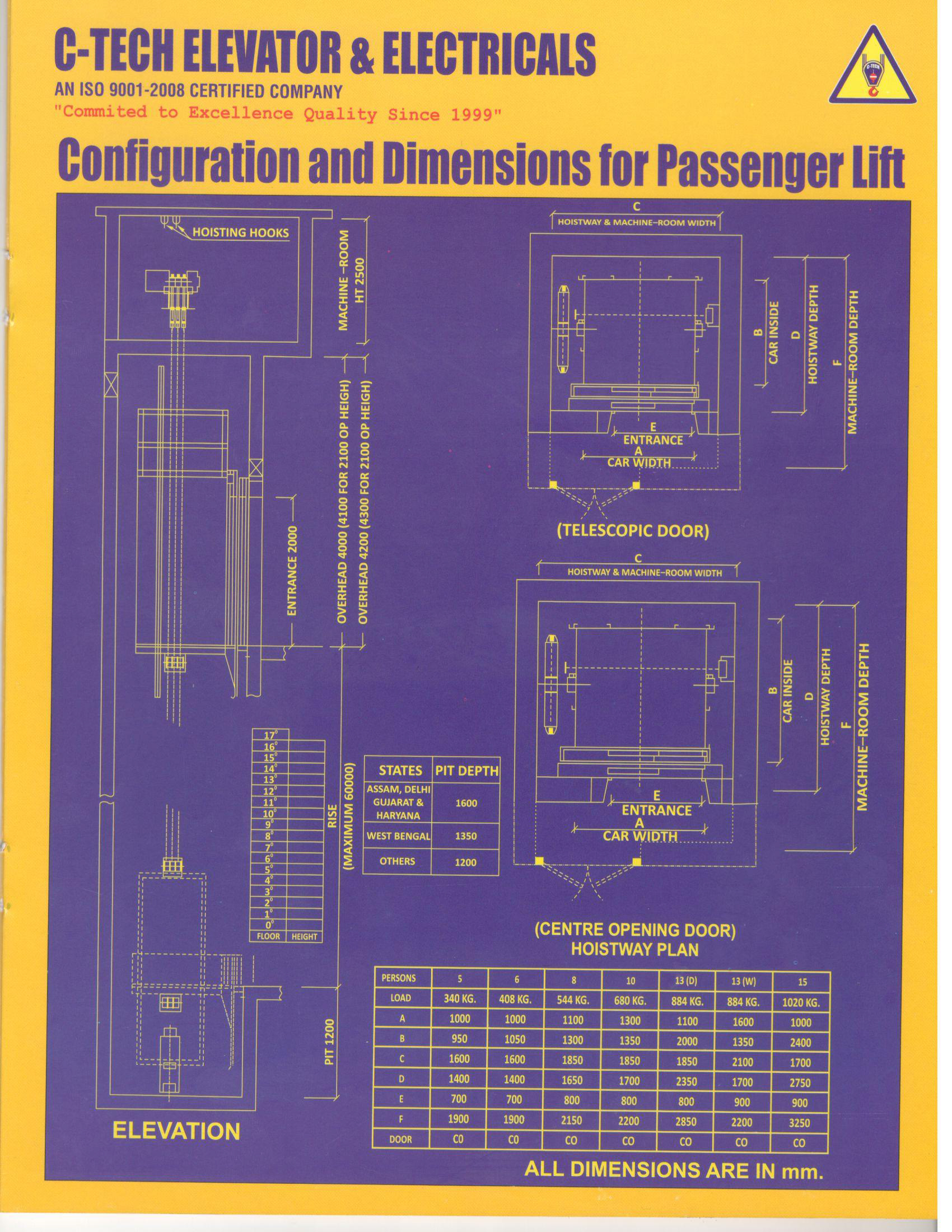 A Passenger lift is designed to ferry people from point A to Point B vertically. The modern passenger lift is a simple means of transport within a building. Passenger elevators capacity is related to the available floor space. Generally passenger elevators are available in typical capacities from 4 TO 26 PASSENGERS and speed varying between 0.5 Meter/sec to 2.5 Meter/Sec. Choice of passenger elevator typically depends on type of building (Commercial, Residential, Hotel, Mall, Housing society etc.,) and parameter such as passenger traffic movement. Budget involved is also a deciding factor between manual door and auto door passenger elevators. C-Tech Elevator offers all types of passenger elevator whether auto door or manually operated doors with variety of aesthetic choices for interior, flooring & false ceiling.
